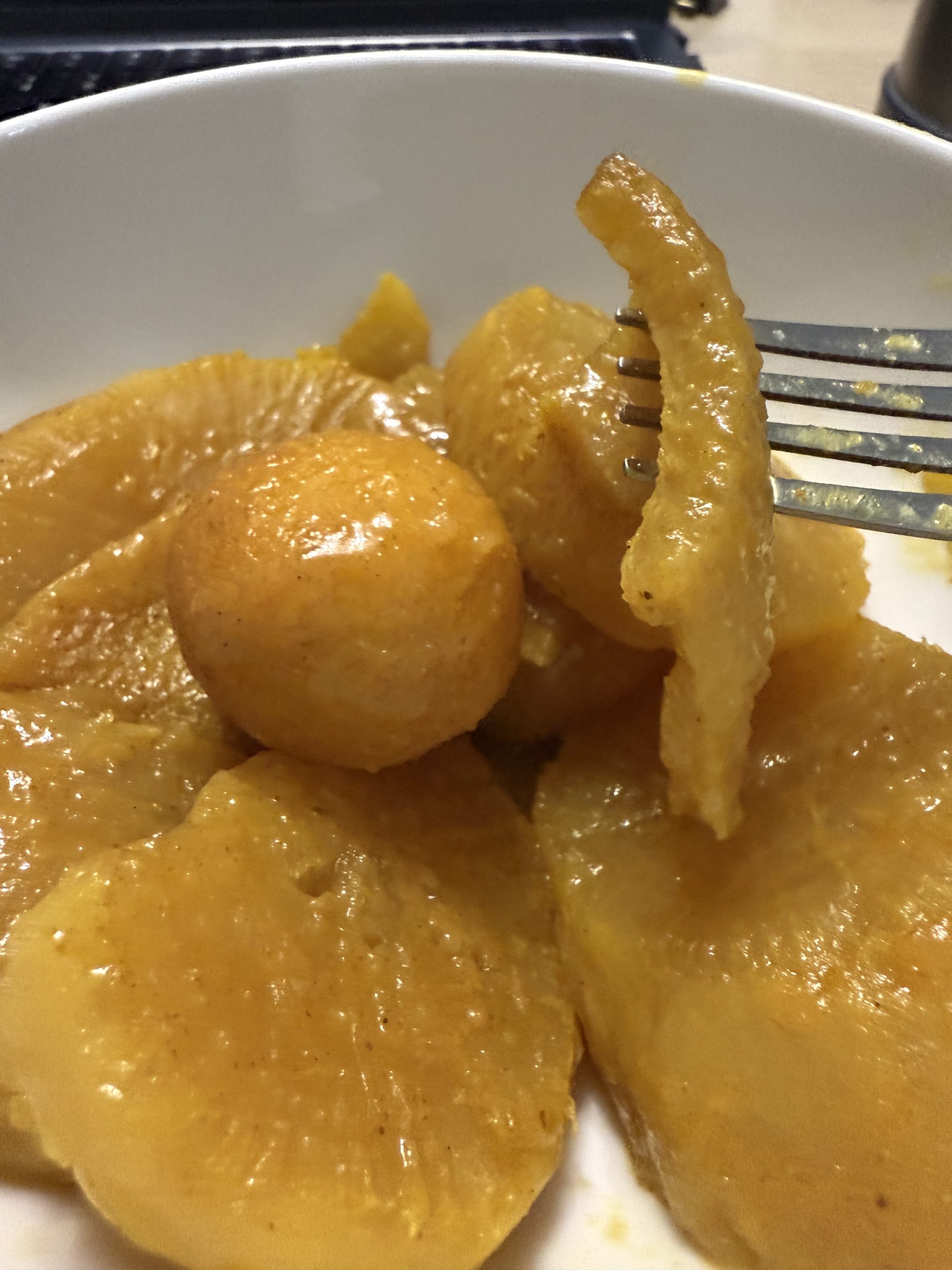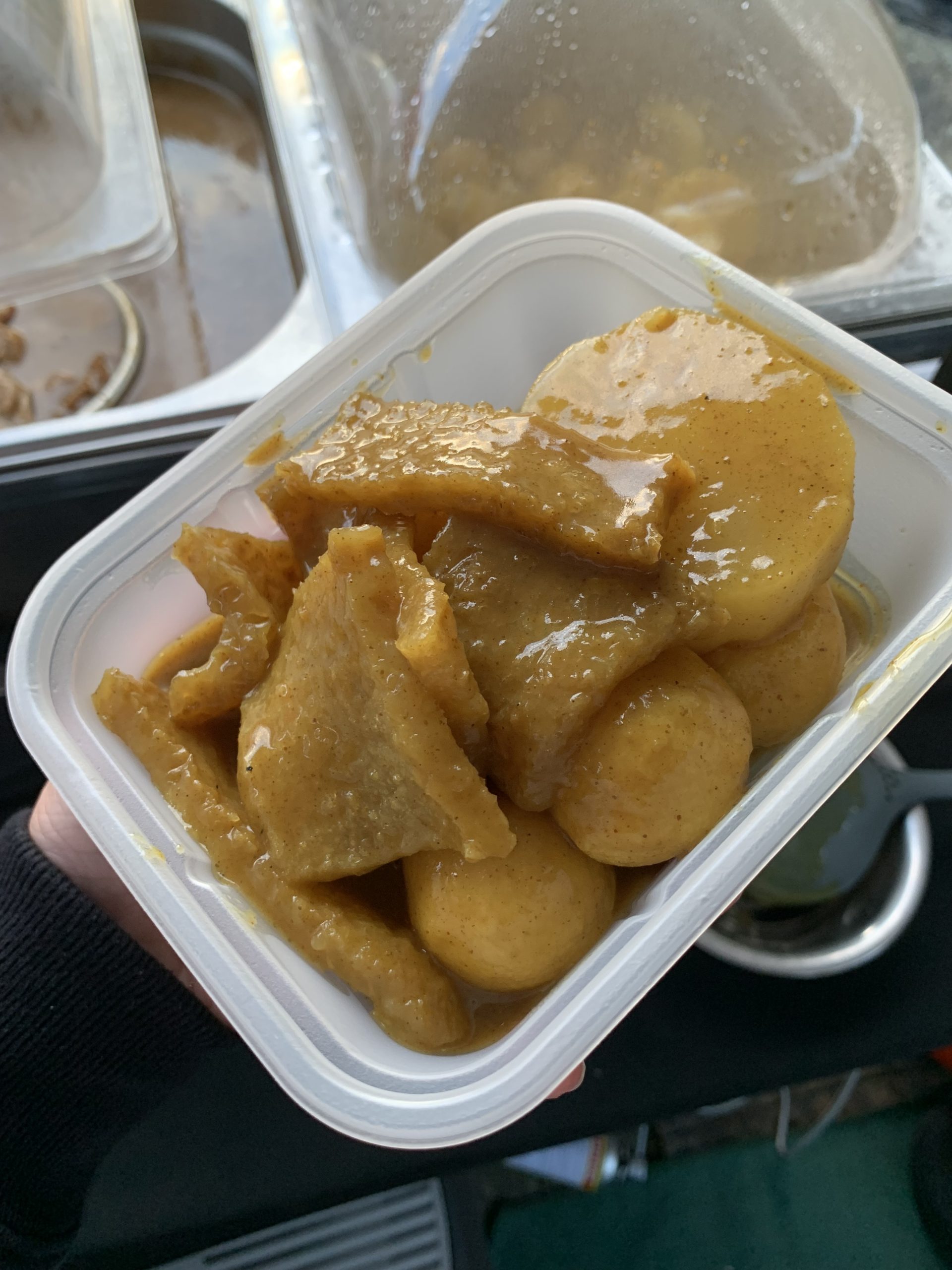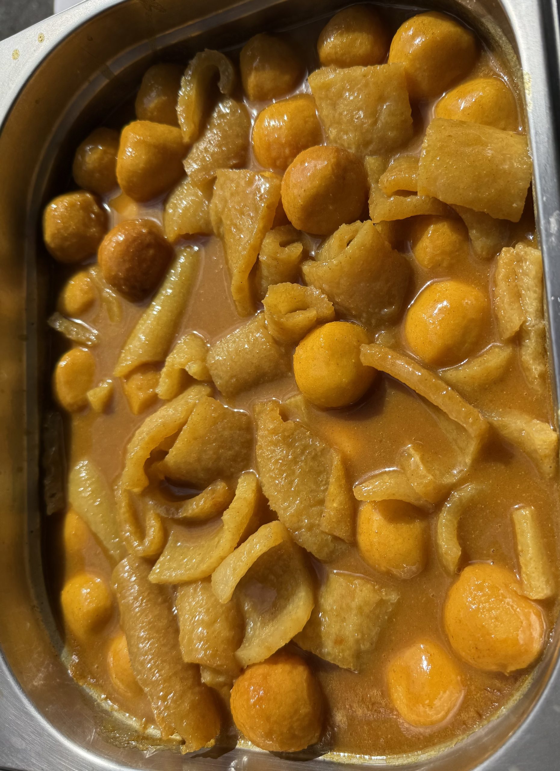 咖喱(小麥粉(麩質);非氫化棕櫚油,咖喱粉(胡蘆巴,薑黃,荽茜,芥末,小茴香,辣椒,茴香,生薑,黑胡椒,大蒜,亞硝酸鹽);增味劑,鹽,糖,馬鈴薯顆粒(脫水馬鈴薯,乳化劑(E471);穩定劑(E450); 抗氧化劑(E304);偏亞硫酸鈉(E223));咖喱粉(辣椒,小茴香,薑黃,紅甜椒);蠔油(水,糖,鹽,高果糖漿,改性澱粉,檸檬酸(E330);增味增(E621);蠔萃取物(甲殼類),焦糖色(E150c);柱侯醬(水,大豆,鹽,小麥粉(麩質),芝麻油,芝麻醬,大蒜,糖,增味劑(E621),防腐劑(E211),增稠劑(E415));糖,增味劑(E261);魚蛋(魚肉,木薯澱粉,棕櫚油,鹽,增味劑(E261);糖,蛋白), 豬皮